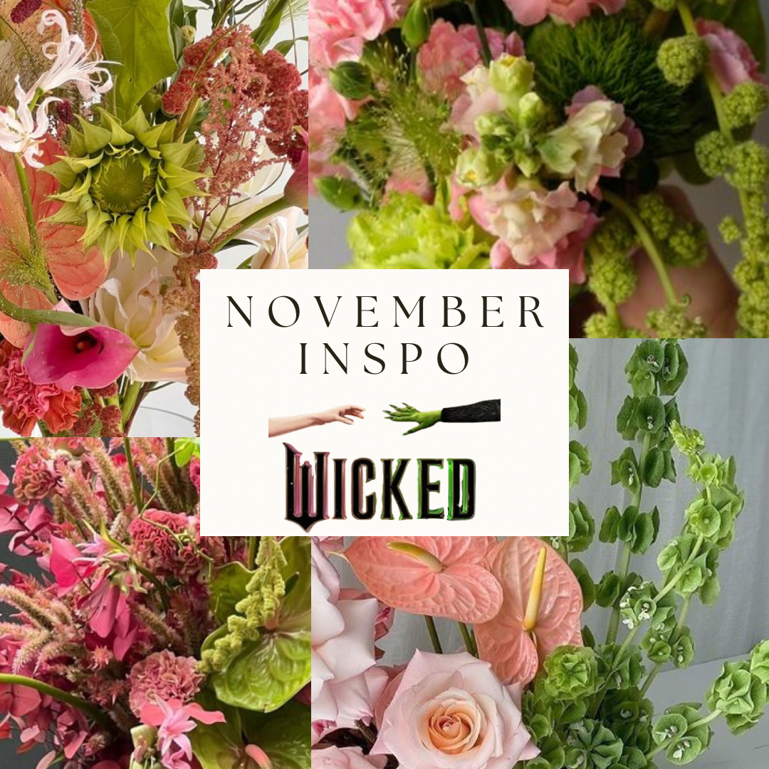 This month’s palette draws from the magic and mischief of Wicked, blending soft pinks and ethereal greens in an unexpected duet that feels both enchanting and a little rebellious. Lush textures, ruffled petals, glossy and feathery stems bring depth and drama, echoing the contrast between the characters. It’s a nod to fall’s moodier side while celebrating transformation, friendship, and the beauty found in what’s perfectly imperfect.