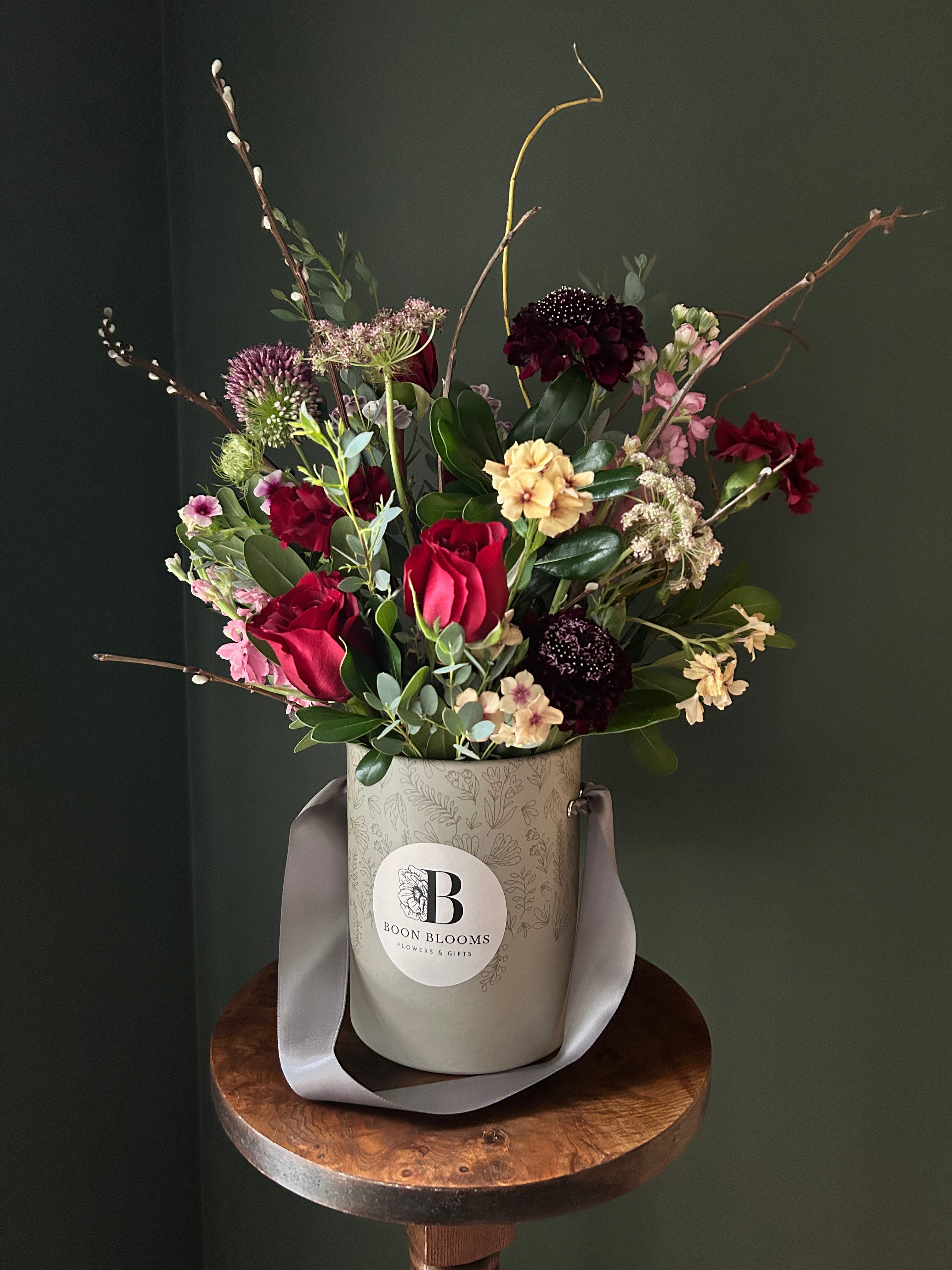 Shop Signature BoxA beautiful and whimsical arrangement styled in a botanical printed hat box. The perfect flower arrangement for birthdays and special occasions!